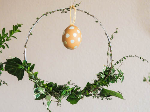 - Eine Kordel abschneiden und am Kranz befestigen. Tipp: Als Highlight habe ich noch selbstbemalte Ostereier in die Mitte gehängt.
