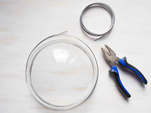- Den Aludraht um die Form (in meinem Fall war das eine IKEA Schüssel mit einem Umfang ca. 20 cm) legen und leicht überlappend mit der Zange ein Ende abzwicken.