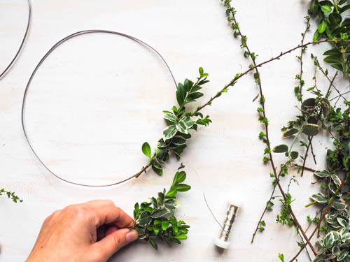 - Tipp: Verwendest du am Anfang und am Ende etwas längere Zweige kannst du diese am Schluss selbst nach oben um den Aludraht wickeln.