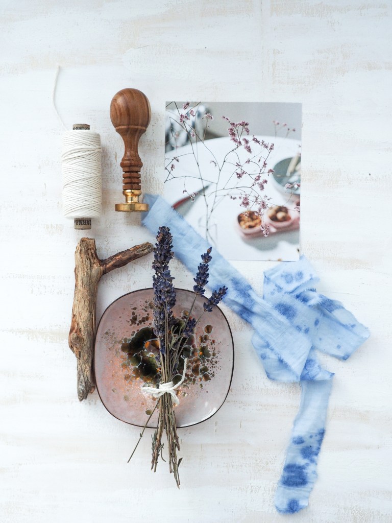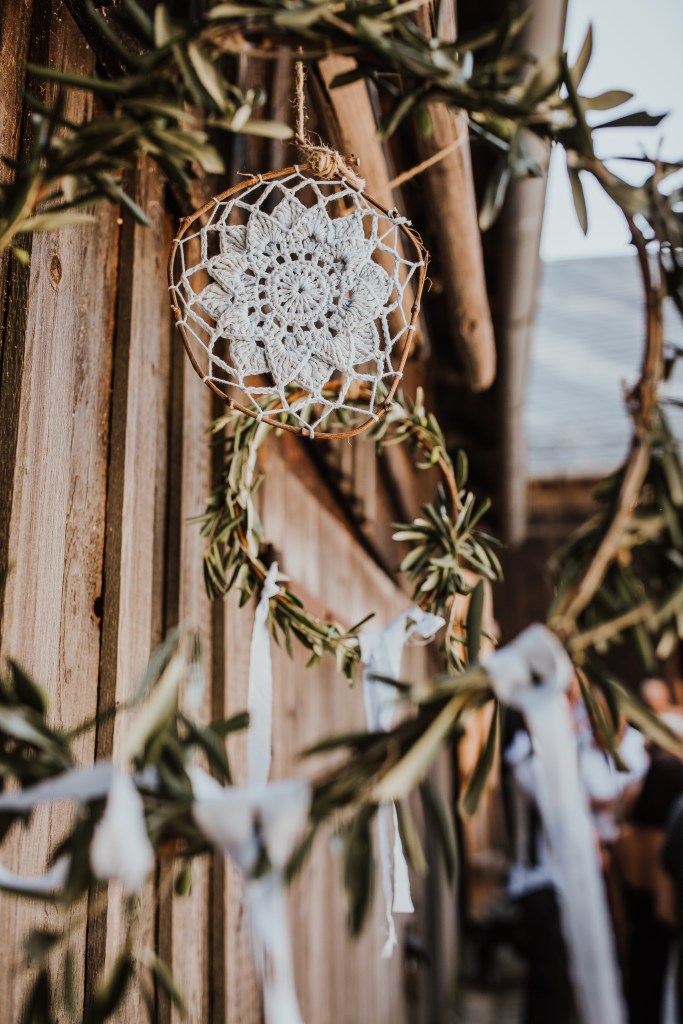 Große warmweiße Glühbirnen bilden ein Zeltdach über dem Raum und sorgen für ein schönes gedämpftes und gemütliches Licht. Über den vier langen Tafeln gibt es hängende Installationen aus gehäkelten Traumfängern in unterschiedlichen Größen und Materialien sowie Kränze aus Oliven- und Eukalyptuszweigen. Blau eingefärbte Bänder aus Baumwolle ergänzen den ein oder anderen Kranz. Stoffservietten ebenfalls in einem zarten Blau eingefärbt sowie Leinentischdecken zieren die Tische. Als Gastgeschenk gab es ein kleines Säckchen mit Lavendel aus dem Garten sowie Thymian und Oregano.