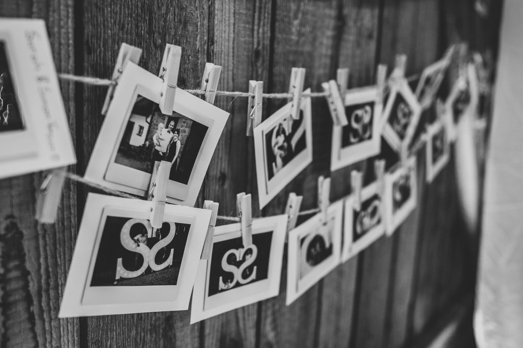 Ein einzigartiges Gästebuch aus breiten Polaroids, die auf Postkarten geklebt werden, um auf der Rückseite einen lieben Gruß an das Brautpaar zu hinterlassen, sammeln sich an der großen Scheunentür.