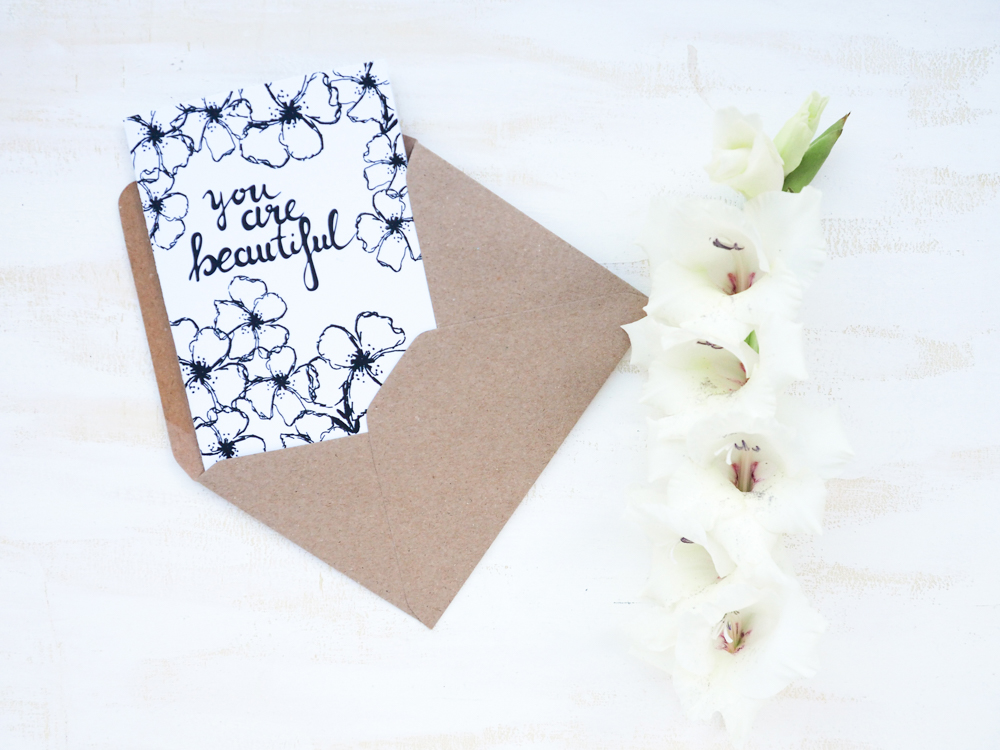 Klappkarte für besondere Menschen Previous Next Veröffentlicht 10. November 2017 in 1000 × 750 in PAPETERIE KLAPPKARTE You are beautiful – 100% handgemalt und auf hochwertiges Papier gedruckt Die Blumen sind mit Aquarellfarben handgemalt, auch die Schrift ist mit der Hand geschrieben und anschließend digitalisiert Gefällt mir Wird geladen …